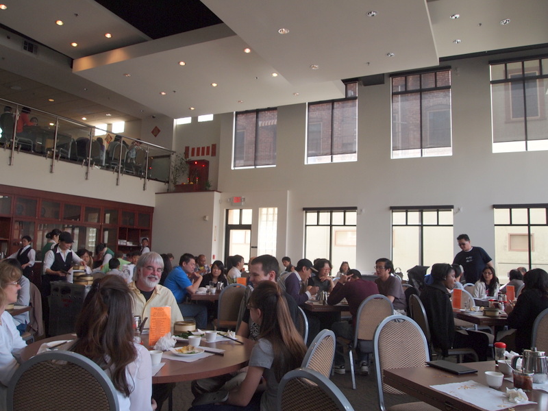 The restaurant also had a number of dim sum carts wheeling around with vegetarian options, more than typical. Besides standards like steamed Chinese broccoli and flat steamed rice noodle rolls, there were more unusual offerings like a steamed rice noodle roll wrapped around fried Chinese dough, excellent Singaporean style fried rice noodles, pan fried scallion cake, seasoned seaweed and chilled bean curd skin. Most of Fu Lam Mum’s customers are Chinese, which means the restaurant also offers more exotic items like beef tripe with ginger, preserved egg porridge, chicken feet, chilled jelly fish and durian paste pastry. But if and probably when I go back, it’ll be for the best taro buns this side of Hong Kong, and definitely not for the chicken feet.