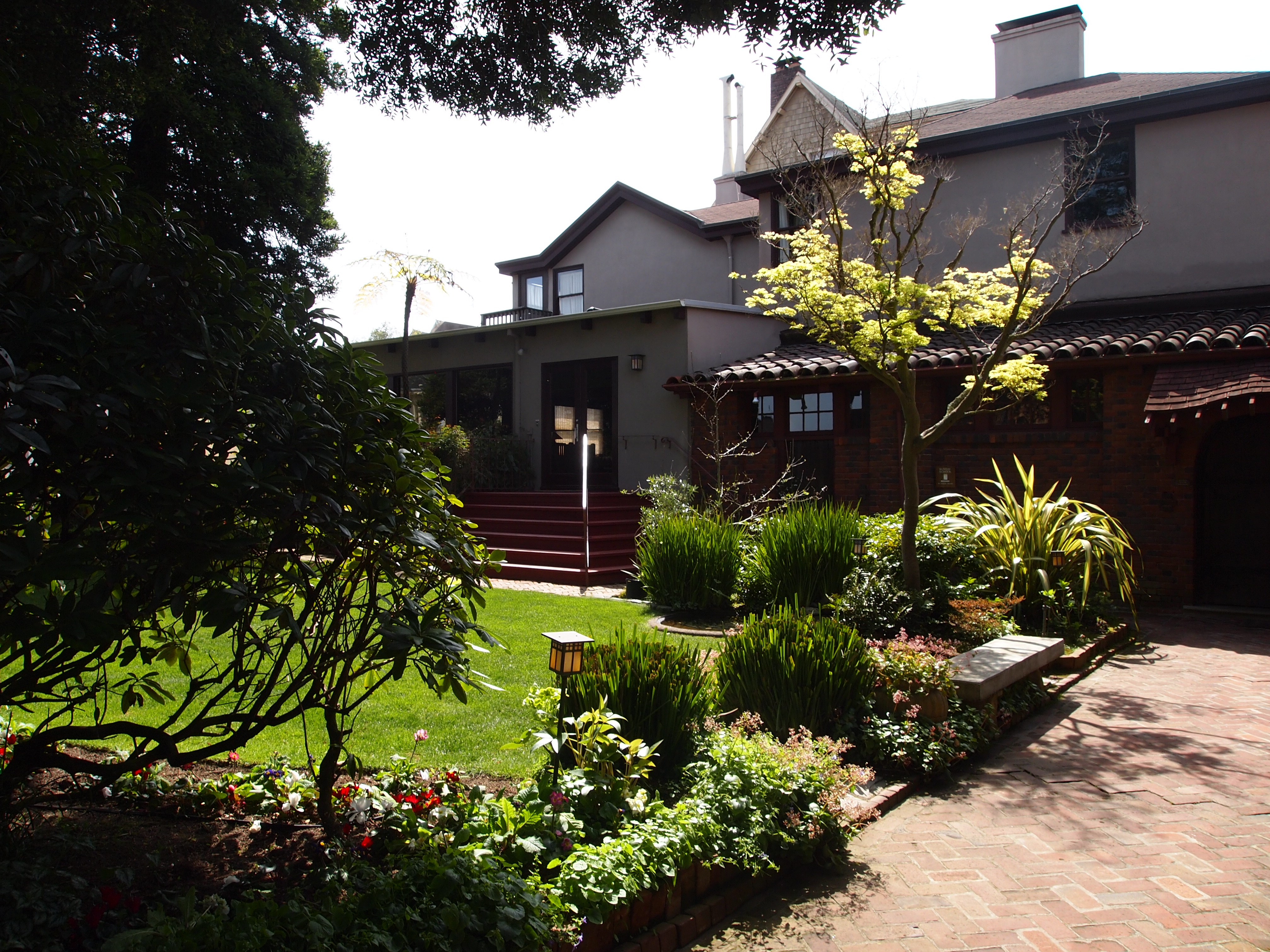 The building also has elements of Mediterranean and Mission Revival style, with covered walkways, arched entryways, unadorned adobe surfaces and clay-tiled roof. And like many mission structures, as soon as you step in from the Lyon street entrance you’re immediately in an intimate, sanctuary-like space, removed from the outside world. To get to the church’s entrance at the back, you follow a path along a beautiful, serene garden, created as a shrine to Swedenborianism’s principles of spirit and nature, the seen and unseen, and also inspired by the era’s interest in all things Japan. The trees originally planted here were cedar, olive, sequoia, elm, pine, myrtle, hawthorn, maple, plum, crabapple and Irish yew.