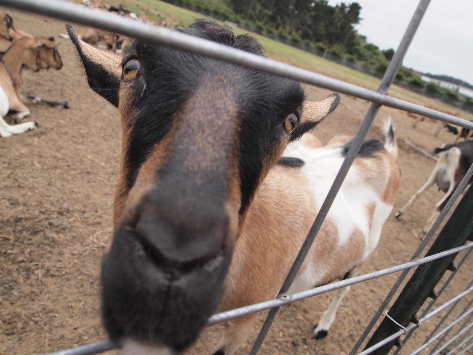 So there’s more to Pescadero than I thought. After heeding the call of the ocean and taking a drive out Hwy 84, past Woodside, Alice’s restaurant, La Honda and San Gregorio General Store, we ended up in, like we always do on these trips, in Pescadero. But instead of our usual stop at Duarte’s and/or one of the two markets in town, we drove down North St, past the elementary and high schools, and stopped at Harley Farms Goat Dairy. An actual functioning goat dairy farm, it also is open to the public to come commune with the goats, which are quite friendly and come right up to the fence for a petting (and maybe a nibble on your sweater if you’re not careful). The farm is quite enterprising, and have opened up a shop in a nearby barn selling goat milk paints, yarns, goat-wool socks and fancy (and expensive) bronze garden tools.