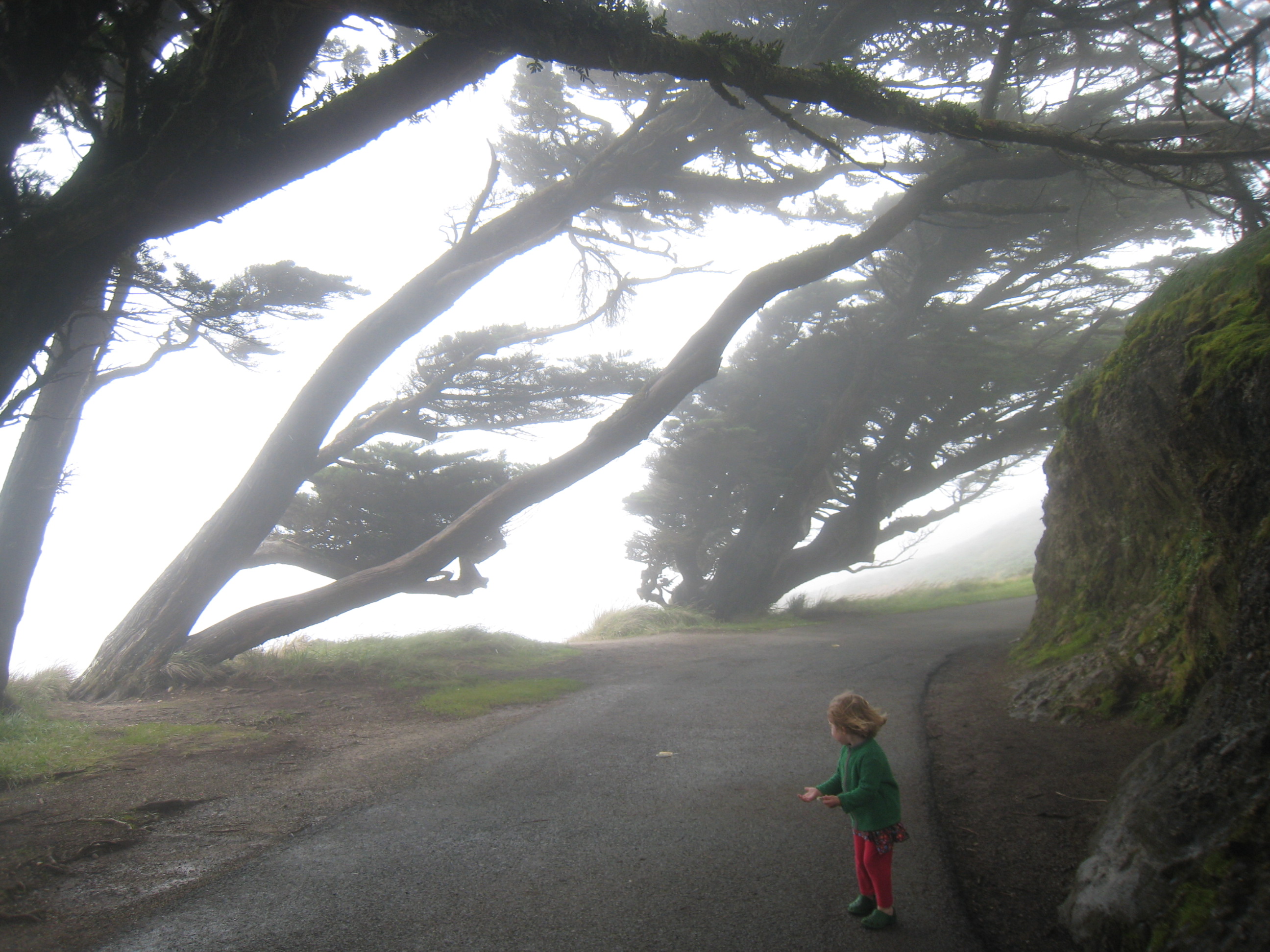 Monterey pines bending leeward.